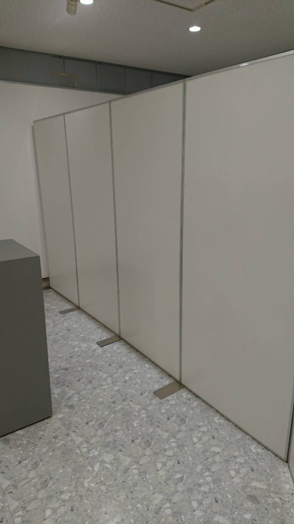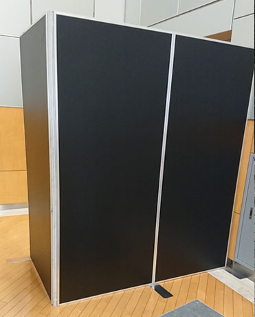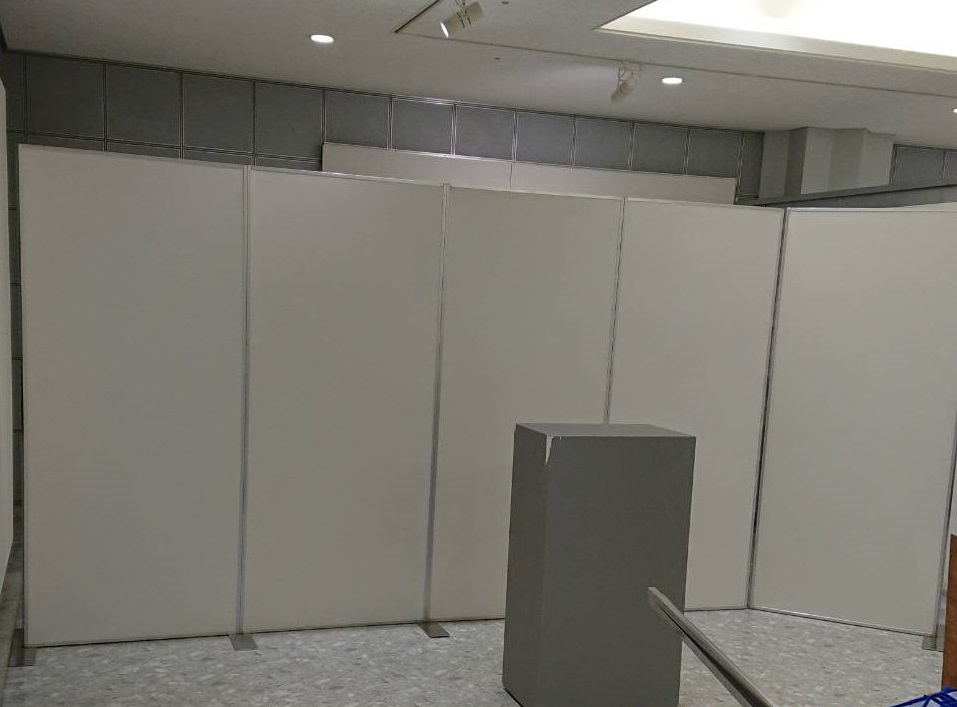 高さ210㎝幅90㎝のものを5枚ご使用になられました。スタッフルームでご使用とのことです。2泊3日1枚¥2900となっております。使用期間が長いのも当社のセールスポイントです。設営もお任せいただいたので、設営費はサービスさせていただきました。また、このボードは画鋲が使用不可となっております。間仕切りやバックボードとしてお使いください。画鋲で留めれるタイプのパネルもご用意しております。パネル、バックボード、パーテーションのレンタルは東京イベントレンタルにお任せください。