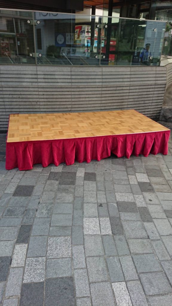 セレモニーやイベントで大活躍のポータブルステージのご紹介です。ワンタッチで本格的なステージが設営できる優れものです。収納時は小スペース、持ち運びはキャスターが付いていますので、設営場所までの運搬も楽に行えます。また、連結ができますので横に三台並べれば、7m20cmの本格舞台を作ることができます。高さが三段階(20cm、40cm、60cm)と調節が可能です。またオプションのワインレッドのスカートを使用すれば高級感が増したステージになります。高さが40cm以上でお使いになる場合は、オプションでステップもご用意しておりますホテル、大会議室などでご好評を頂いておりますポータブルステージのレンタルは東京イベントレンタルにお任せください