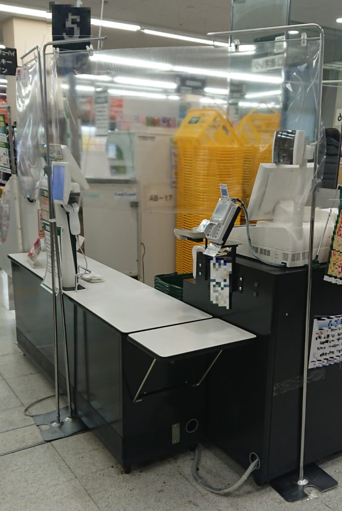 通常1か月¥6000なのですが、¥3000にてご提供させていただきます。下の例ではレジ周りに設置した例です。透明ビニールはご希望の方に別途ご用意させていただきます。※ビニールシートの在庫が少なくなってきていますので、弊社でのご提供は時間がかかることがございます。